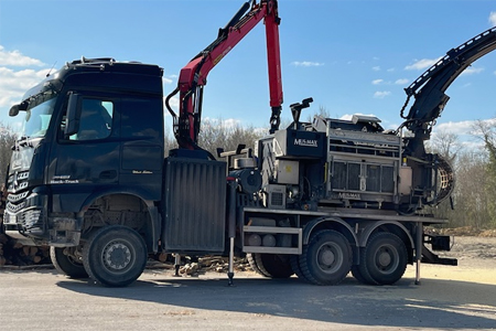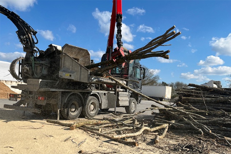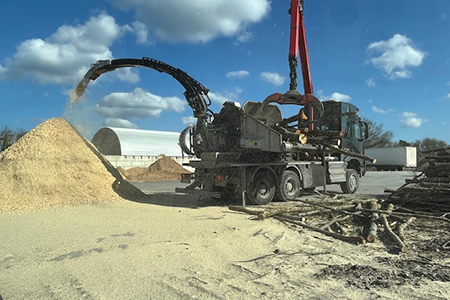 Pour la production de plaquettes forestières, la société possède un broyeur à plaquettes Mus Max T11 de capacité entrée 800 x 1200 sur camion 580 cv